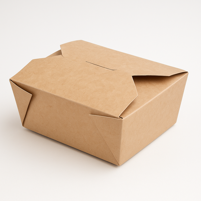 Eco-friendly, 100% natural and biodegradable paper take-away boxes with a kraft brown color. Perfect for food trucks, burger joints, cafes, and takeout. Capacity: 500 ml.